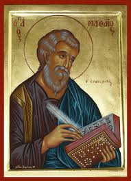Ο Ματθαίος , γιος του Αλφαίου, ήταν τελώνης και, όταν τον είδε καθήμενο ο Κύριος στην Καπερναούμ, του είπε: ακολούθει μοι. Και αναστάς ηκολούθησεν αυτώ ( Ματθ. 9, 9 ) . Μετά απ’ αυτό ο Ματθαίος προετοίμασε γεύμα στο σπίτι του για τον Κύριο Ιησού Χριστό. Έτσι δόθηκε η ευκαιρία στον Κύριο να εκφράσει ορισμένες γενικές αλήθειες για την έλευσή του στη γη. Αφού δέχθηκε τη χάρη του Αγίου Πνεύματος, ο Ματθαίος κήρυξε το Ευαγγέλιο στους Πάρθους, τους Μήδους και τους Αιθίοπες. Στην Αιθιοπία όρισε Επίσκοπο τον ακόλουθό του Πλάτωνα και ύστερα αποσύρθηκε στη μόνωση της ησυχίας, προσευχόμενος στο όρος , όπου ο Κύριος του παρουσιάστηκε.