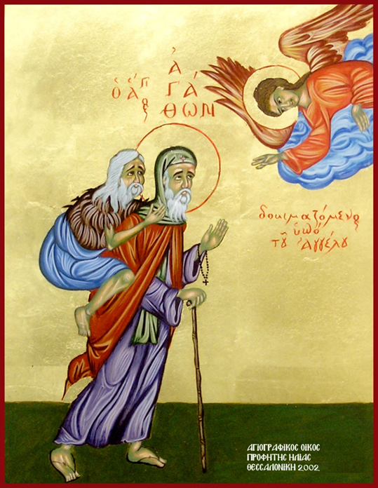 Ο αγαθότατος Αγάθων τον φορτώθηκε στην πλάτη του και τον μετέφερε με πολύ δυσκολία, γιατί ήταν κατάκοπος απότην εργασία της ημέρας.