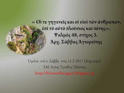 « Οἱ τε γηγενεῖς και οἱ υἱοί τῶν ἀνθρώπων, ἐπί τό αὐτό πλούσιος καί πένης».Ψαλμός 48, στίχος 3. Ἀρχ. Σάββας Ἁγιορείτης Ὁμιλία τοῦ π. Σάββα στίς 12-2-2017 (Κήρυγμα) Ἱ.Μ. Ἁγίας Τριάδος Ἐδέσσης http://hristospanagia3.blogspot.com