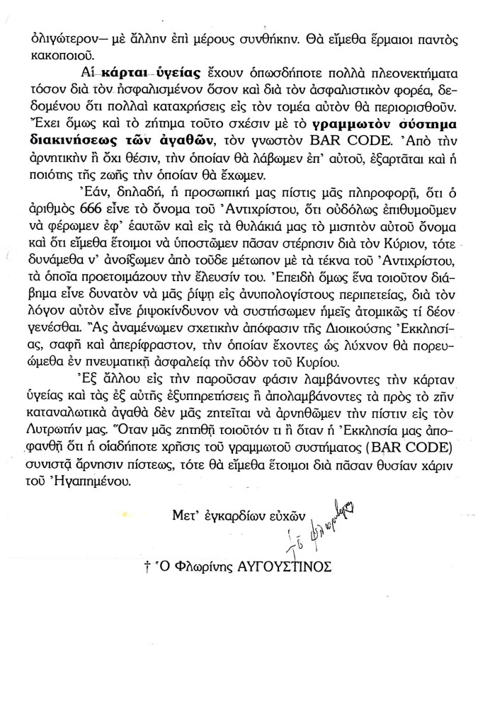 Μικρὸ ἀπόσπασμα ἀγωνιώδους τρισέλιδης ἐπιστολῆς στὸν Μητροπολίτη Φλωρίνης, Πρεσπῶν & Ἑορδαίας π. Αὐγουστῖνο Καντιώτη, ἀπό ὁμάδα ὀρθοδόξων χριστιανῶν τοῦ Ρεθύμνου, γραμμένη ἀπό Ελένη Β… καὶ στή συνέχεια ὁλόκληρη ἡ σαφή ἀπάντηση τοῦ ἀγωνιστοῦ Ἱεράρχου, μὲ τὴν ὑπογραφή του.«…Πρίν προχωρήσουμε ζητοῦμε συγχώρεση, ποὺ λαμβάνουμε τὸ θάρρος νὰ σᾶς ἀπευθύνουμε αὐτὴ τὴν ἐπιστολή, ἀλλὰ ὑπάρχει σοβαρός λόγος τὸν ὁποῖο σᾶς ἐκθέτουμε ἀμέσως παρακάτω: Ἐδῶ καὶ ἀρκετὸ καιρό, ὅπως θὰ γνωρίζετε, ἔχει δημιουργηθεῖ ἀρκετὸς θόρυβος γύρω ἀπὸ τὸ θέμα: Ἠλεκτρονικὲς κάρτες Ὑγείας – ΑΜΚΑ»… καὶ οἱ ἀπόψεις τῶν χριστιανῶν διίστανται. Ἄλλοι χλευάζουν, λέγοντας ὅτι εἴμεθα φαντασιόπληκτοι καὶ ὅτι ὁ γραμμωτὸς κώδικας- 666 (BAR CODE), ποὺ σαφῶς ἐνυπάρχει στὶς νέες κάρτες, εἶναι ἀθῶος. Ἄλλοι ἀμφιταλαντεύονται μεταξύ τοῦ «εἶναι δὲν εἶναι» καὶ ἄλλοι τέλος (οἱ ἑλάχιστότεροι), εἶναι ἀκλόνητα ἀρνητικοὶ ἀπέναντι των…..Συγχωρέστε μας, ποὺ σᾶς κουράζουμε ἀλλὰ ἐπειδὴ εἶσθε ἀγωνιστὴς Ἱεράρχης, μὲ ἀνάλογη φήμη στὸν ἑλληνικὸ χῶρο, ὅπως καταλαβαίνετε ὁ λόγος σας «ἔχει μεγάλη βαρύτητα»….Θὰ σᾶς παρακαλέσουμε λοιπὸν θερμά, μὲ ὅλο τὸ σεβασμό, ἂν εἶναι δυνατὸν, διὰ μιᾶς ἐπιστολῆς σας λακωνικῆς ἔστω, νὰ τοποθετηθεῖτε ξεκάθαρα ἀρνητικὰ ἢ θετικὰ ἔναντι τῶν ἠλεκτρονικῶν καρτῶν Ὑγείας, αὐτοκινήτου κ.λ.π. γενικῶς ὁτιδήποτε μὲ BAR CODE καὶ 666, γιὰ νὰ ἡρεμήσουν καὶ οἱ ἐδῶ χριστιανοί, καὶ νὰ πάψει ἡ ἐνυπάρχουσα σύγχυση…Απαντηση τοῦ Μητροπολίτου Φλωρίνης Αὐγουστίνου(Κάντε κλικ ἐπάνω στὶς σελίδες τῆς ἐπιστολῆς & κατεβᾶστε τις σε μεγάλο μεγεθος)Ο ΜΗΤΡΟΠΟΛΙΤΗΣΦΛΩΡΙΝΗΣ, ΠΡΕΣΠΩΝ & ΕΟΡΔΑΙΑΣ ΑΥΓΟΥΣΤΙΝΟΣ53100 ΦΛΩΡΙΝΑἘν Φλωρίνῃ τῇ 30ῇ Ἰουνίου 1995Πρὸς Ε…. Β….741 00 ΡΕΘΥΜΝΟΝΓια τας ηλεκτρονικάς ταυτότητας η θέσις μας είναι σαφής. Δεν θα τις παραλάβωμε.Ἐλάβομεν τὴν ἐπιστολήν σας, ἡ ὁποία εἶνε ἐνδεικτική τοῦ προβληματισμοῦ, ὁ ὁποῖος ταλανίζει μερίδα τοῦ χριστεπωνύμου πληρώματος.Τό μὲν κράτος ἐπείγεται εἰς τὴν ἐφαρμογὴν τῆς μηχανοργανώσεως, ἡ ὁποία ἀναμφισβητήτως θὰ ἔχῃ καταπληκτικὰ ἀποτελέσματαα εἰς ὅλους τοὺς τομεῖς του. Οἱ πολῖται ὅμως ἀγωνιοῦν διὰ τὰς πνευματικὰς κυρίως συνεπείας, αἱ ὁποῖαι θὰ προκύψουν ἐκ τῆς μηχανοργανώσεως αὐτῆς.Τὸ ὅλον πρόβλημα εἶνε τεράστιον, παρουσιάζει δὲ τὰς ἑξῆς πλευράς.α´) Τῶν ἠλεκτρονικῶν ταὐτοτήτων (ἠλεκτρονικὸν φακέλλωμα).β´) Τῶν καρτῶν ὑγείας.Καὶ γ´) Τῶν ἀγαθῶν τῶν διακινουμένων μὲ τὸ γνωστὸν γραμμωτὸν σύστημα (BAR CODE).Θὰ ἦτο εὐχῆς ἔργον ἐὰν ἡ Διοικοῦσα Ἐκκλησία ἔδιδεν ἐπίσημη καὶ ὑπεύθυνη ἀπάντησιν και ὡς πρὸς τὰς τρεῖς ὡς ἄνω πλευρὰς τοῦ ζητήματος. Ἀλλ᾽αὕτη δυστυχῶς περὶ ἄλλα μερινᾷ καὶ τυρβάζεται. Μέχρις ὅτου ὅμως ἐκδοθῇ τοιαύτη ἀπόφασις, τολμῶμεν ἀπαντῶντες εἰς τὰ ἐρωτήματά σας νὰ εἴπωμεν τὰ ἑξῆς ὀλίγαΔιὰ τὰς ἠλεκτρονικὰς ταὐτότητας ἡ θέσις μας εἶναι σαφής. Δὲν θὰ τὶς παραλάβωμεν. Ὄχι μόνον διὰ θρησκευτικοὺς λόγους (666), ἀλλὰ καὶ διότι δι᾽ αὐτῶν θεσμοθετεῖται μία νέα σκλαβιά, ἀγνώστου διαρκείας, βαρβαρότητος καὶ ἐκληματικότητος. Διὰ τοῦτο καὶ ἡμεῖς ἐχαρακτηρίσαμεν τὴν ὅλην προσπάθειαν ὡς ἐλευθεριοκτόνον. Ἐὰν καθιερωθοῦν αἱ ἠλεκτρονικαὶ ταὐτότητες, τὸ ἀπόρρητον τῶν προσωπικῶν στοιχείων ἑκάστου πολίτου δὲν δύναται νὰ ἐξασφαλισθῇ οὔτε μὲ διεθνῆ οὔτε -πολύ ὀλιγώτερον- μὲ ἄλλη ἐπὶ μέρ