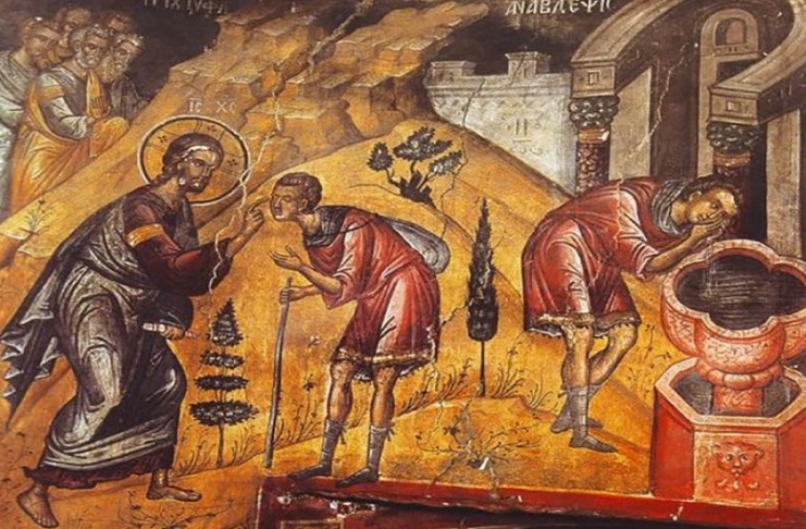 Η ΕΥΑΓΓΕΛΙΚΗ ΠΕΡΙΚΟΠΗ ΤΗΣ ΚΥΡΙΑΚΗΣ ΤΟΥ ΤΥΦΛΟΥΚατά Ιωάννην, κεφ. Θ΄, εδάφια 1-381Καί παράγων εἶδεν ἄνθρωπον τυφλὸν ἐκ γενετῆς. 2 Καὶ ἠρώτησαν αὐτὸν οἱ μαθηταὶ αὐτοῦ λέγοντες· ῥαββί, τίς ἥμαρτεν, οὗτος ἢ οἱ γονεῖς αὐτοῦ, ἵνα τυφλὸς γεννηθῇ; 3 Ἀπεκρίθη ᾿Ιησοῦς· οὔτε οὗτος ἥμαρτεν οὔτε οἱ γονεῖς αὐτοῦ, ἀλλ' ἵνα φανερωθῇ τὰ ἔργα τοῦ Θεοῦ ἐν αὐτῷ. 4 Ἐμὲ δεῖ ἐργάζεσθαι τὰ ἔργα τοῦ πέμψαντός με ἕως ἡμέρα ἐστίν· ἔρχεται νὺξ ὅτε οὐδεὶς δύναται ἐργάζεσθαι. 5 Ὃταν ἐν τῷ κόσμῳ ᾦ, φῶς εἰμι τοῦ κόσμου. 6Ταῦτα εἰπὼν ἔπτυσε χαμαὶ καὶ ἐποίησε πηλὸν ἐκ τοῦ πτύσματος, καὶ ἐπέχρισε τὸν πηλὸν ἐπὶ τοὺς ὀφθαλμοὺς τοῦ τυφλοῦ 7 καὶ εἶπεν αὐτῷ· ὕπαγε νίψαι εἰς τὴν κολυμβήθραν τοῦ Σιλωάμ, ὃ ἑρμηνεύεται ἀπεσταλμένος. Ἀπῆλθεν οὖν καὶ ἐνίψατο, καὶ ἦλθε βλέπων.8 Οἱ οὖν γείτονες καὶ οἱ θεωροῦντες αὐτὸν τὸ πρότερον ὅτι τυφλὸς ἦν, ἔλεγον· οὐχ οὗτός ἐστιν ὁ καθήμενος καὶ προσαιτῶν; 9 Ἄλλοι ἔλεγον ὅτι οὗτός ἐστιν· ἄλλοι δὲ ὅτι ὅμοιος αὐτῷ ἐστιν. Ἐκεῖνος ἔλεγεν ὅτι ἐγώ εἰμι. 10Ἒλεγον οὖν αὐτῷ· πῶς ἀνεῴχθησάν σου οἱ ὀφθαλμοί; 11 Ἀπεκρίθη ἐκεῖνος καὶ εἶπεν· ἄνθρωπος λεγόμενος ᾿Ιησοῦς πηλὸν ἐποίησε καὶ ἐπέχρισέ μου τοὺς ὀφθαλμοὺς καὶ εἶπέ μοι· ὕπαγε εἰς τὴν κολυμβήθραν τοῦ Σιλωὰμ καὶ νίψαι· ἀπελθὼν δὲ καὶ νιψάμενος ἀνέβλεψα. 12 Εἶπον οὖν αὐτῷ· ποῦ ἐστιν ἐκεῖνος; λέγει· οὐκ οἶδα.13 ῎Αγουσιν αὐτὸν πρὸς τοὺς Φαρισαίους, τόν ποτε τυφλόν. 14 Ἦν δὲ σάββατον ὅτε τὸν πηλὸν ἐποίησεν ὁ ᾿Ιησοῦς καὶ ἀνέῳξεν αὐτοῦ τοὺς ὀφθαλμούς. 15 Πάλιν οὖν ἠρώτων αὐτὸν καὶ οἱ Φαρισαῖοι πῶς ἀνέβλεψεν. Ὁ δὲ εἶπεν αὐτοῖς· πηλὸν ἐπέθηκέ μου ἐπὶ τοὺς ὀφθαλμούς, καὶ ἐνιψάμην, καὶ βλέπω. 16 Ἒλεγον οὖν ἐκ τῶν Φαρισαίων τινές· οὗτος ὁ ἄνθρωπος οὐκ ἔστι παρὰ τοῦ Θεοῦ, ὅτι τὸ σάββατον οὐ τηρεῖ. Ἄλλοι ἔλεγον· πῶς δύναται ἄνθρωπος ἁμαρτωλὸς τοιαῦτα σημεῖα ποιεῖν; Καὶ σχίσμα ἦν ἐν αὐτοῖς.17 Λέγουσι τῷ τυφλῷ πάλιν· σὺ τί λέγεις περὶ αὐτοῦ, ὅτι ἤνοιξέ σου τοὺς ὀφθαλμούς; ὁ δὲ εἶπεν ὅτι προφήτης ἐστίν.18 Οὐκ ἐπίστευσαν οὖν οἱ ᾿Ιουδαῖοι περὶ αὐτοῦ ὅτι τυφλὸς ἦν καὶ ἀνέβλεψεν, ἕως ὅτου ἐφώνησαν τοὺς γονεῖς αὐτοῦ τοῦ ἀναβλέψαντος 19 καὶ ἠρώτησαν αὐτοὺς λέγοντες· οὗτός ἐστιν ὁ υἱὸς ὑμῶν, ὃν ὑμεῖς λέγετε ὅτι τυφλὸς ἐγεννήθη; Πῶς οὖν ἄρτι βλέπει; 20 Ἀπεκρίθησαν δὲ αὐτοῖς οἱ γονεῖς αὐτοῦ καὶ εἶπον· οἴδαμεν ὅτι οὗτός ἐστιν ὁ υἱὸς ἡμῶν καὶ ὅτι τυφλὸς ἐγεννήθη· 21 πῶς δὲ νῦν βλέπει οὐκ οἴδαμεν, ἢ τίς ἤνοιξεν αὐτοῦ τοὺς ὀφθαλμοὺς ἡμεῖς οὐκ οἴδαμεν· αὐτὸς ἡλικίαν ἔχει, αὐτὸν ἐρωτήσατε, αὐτὸς περὶ ἑαυτοῦ λαλήσει. 22 Ταῦτα εἶπον οἱ γονεῖς αὐτοῦ, ὅτι ἐφοβοῦντο τοὺς ᾿Ιουδαίους· ἤδη γὰρ συνετέθειντο οἱ ᾿Ιουδαῖοι ἵνα, ἐάν τις αὐτὸν ὁμολογήσῃ Χριστόν, ἀποσυνάγωγος γένηται. 23 Διὰ τοῦτο οἱ γονεῖς αὐτοῦ εἶπον ὅτι ἡλικίαν ἔχει, αὐτὸν ἐρωτήσατε.24 Ἐφώνησαν οὖν ἐκ δευτέρου τὸν ἄνθρωπον ὃς ἦν τυφλός, καὶ εἶπον αὐτῷ· δὸς δόξαν τῷ Θεῷ· ἡμεῖς οἴδαμεν ὅτι ὁ ἄνθρωπος οὗτος ἁμαρτωλός ἐστιν. 25 Ἀπεκρίθη οὖν ἐκεῖνος καὶ εἶπεν· εἰ ἁμαρτωλός ἐστιν οὐκ οἶδα· ἓν οἶδα, ὅτι τυφλὸς ὢν ἄρτι βλέπω. 26 Εἶπον δὲ αὐτῷ πάλιν· τί ἐποίησέ σοι; πῶς ἤνοιξέ σου τοὺς ὀφθαλμούς; 27 Ἀπεκρίθη αὐτοῖς· εἶπον ὑμῖν ἤδη, καὶ οὐκ ἠκούσατε· τί πάλιν θέλετε ἀκούειν; Μὴ καὶ ὑμεῖς θέλετε αὐτοῦ μαθηταὶ γενέσθαι; 28 Ἐλοιδόρησαν αὐτὸν καὶ εἶπον· σὺ εἶ μαθητὴς ἐκείνο